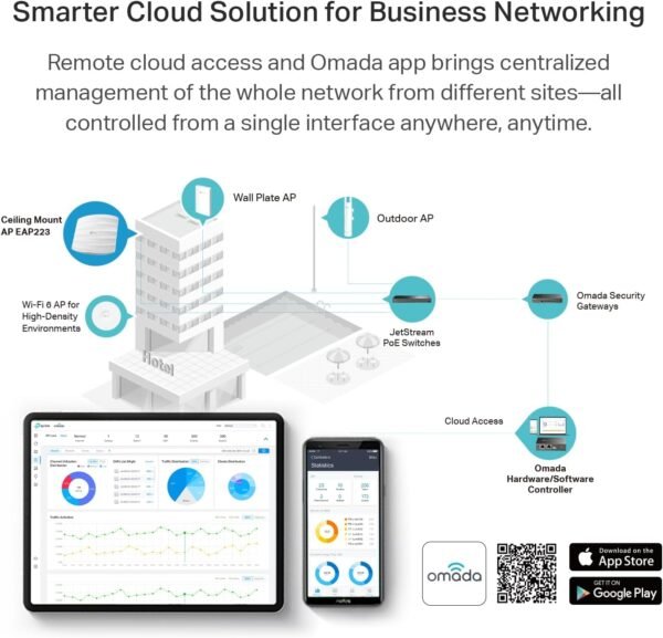 The EAP223 integrates smoothly into the Omada SDN (Software Defined Networking) platform, enabling centralized management, cloud control, and remote configuration via the Omada app or web interface. Enjoy advanced wireless features like band steering, load balancing, and captive portal authentication to ensure optimal performance and security.